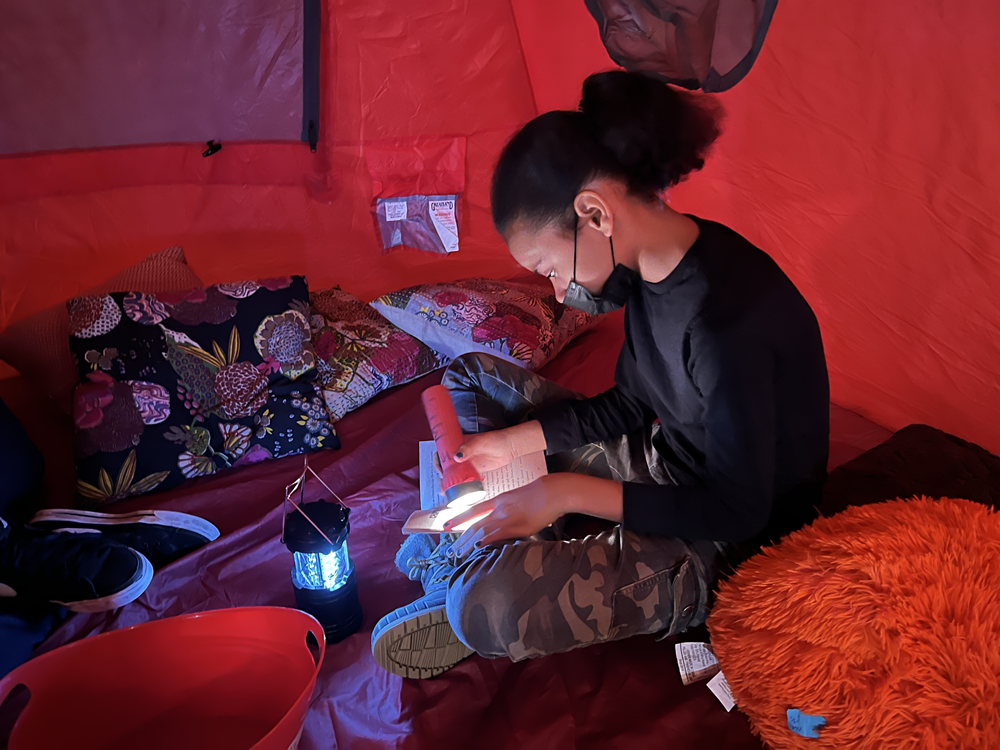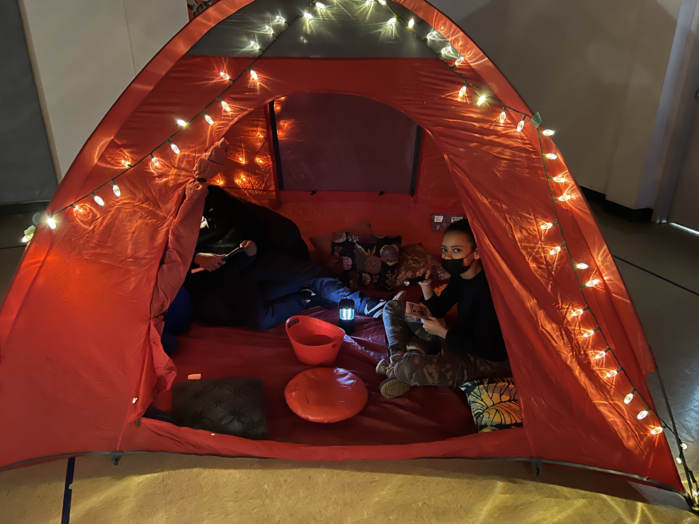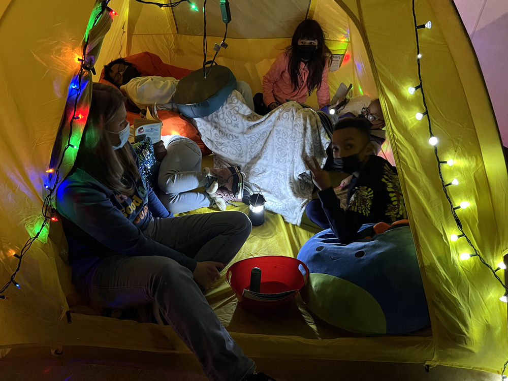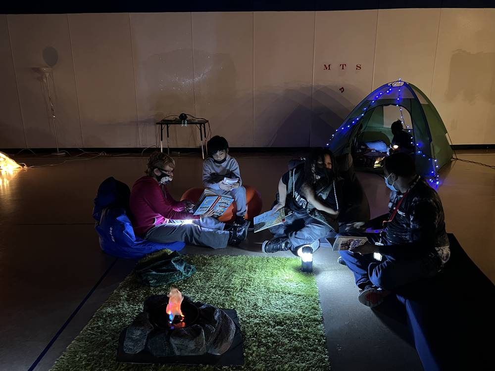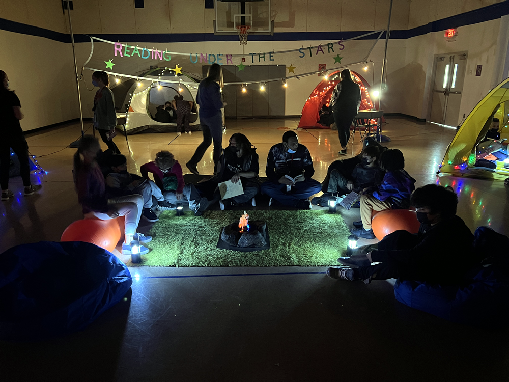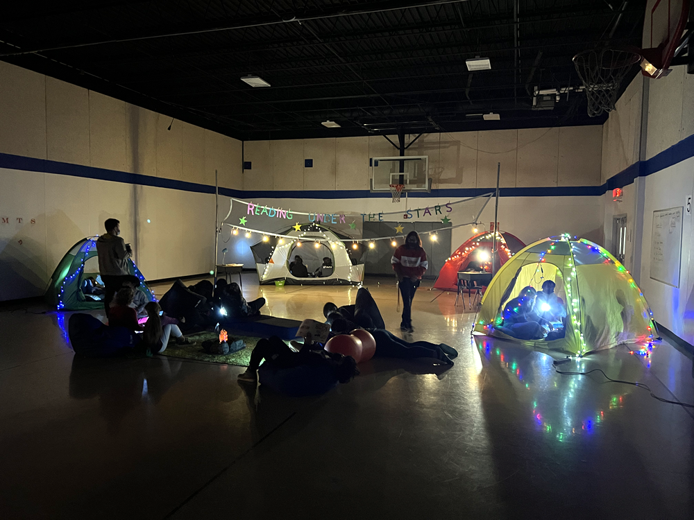 This year, the MTS Elementary gym was transformed into the beautiful outdoors under nighttime skies. With tents full of pillows, blankets and flashlights, and twinkling lights, students came into the gym with a favorite book, found a cozy spot inside a tent or around the campfire and read.