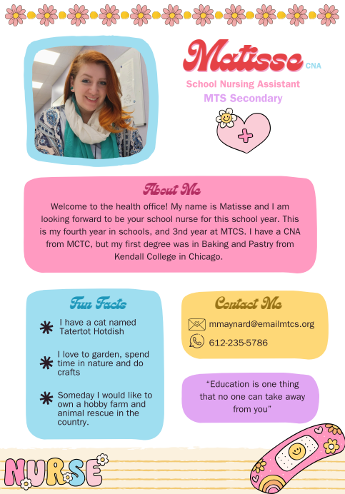 MTCS health services consists of trained health assistants working under the delegation of a licensed school nurse to provide a variety of medical procedures that support a healthy learning environment for all students.