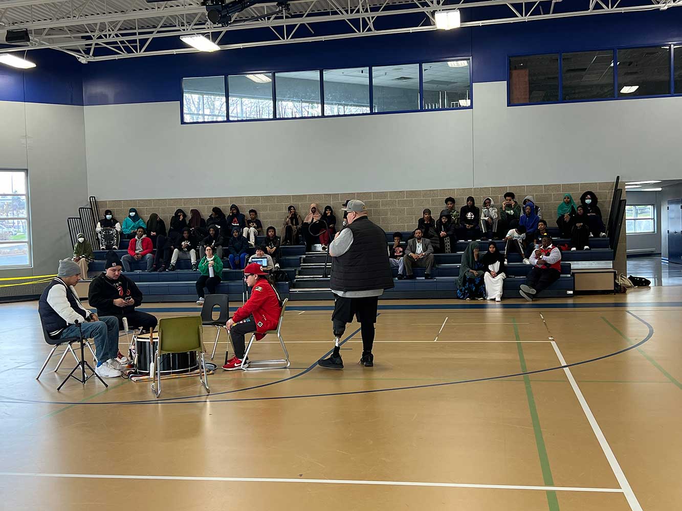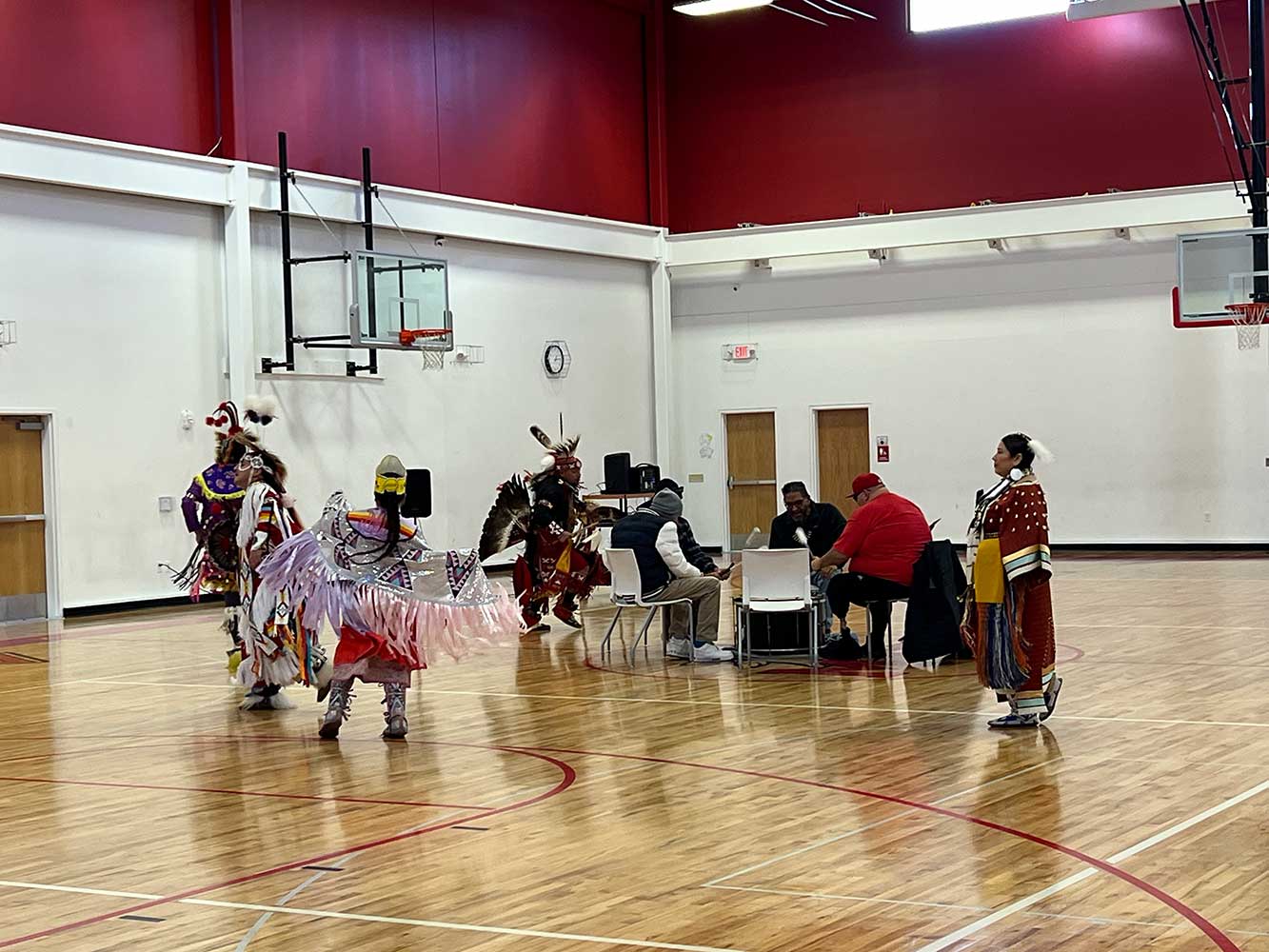 Following the Indigenous games and movement experience, the schools were visited by the Gakaabikaang Drum and Dance Troupe. Powerful drumming and singing filled the gym and dancers in full dress, complete with feathers and bells. The soulful songs and the deep drumbeat was very moving. The MTCS virtual schools also participated through online connections.
